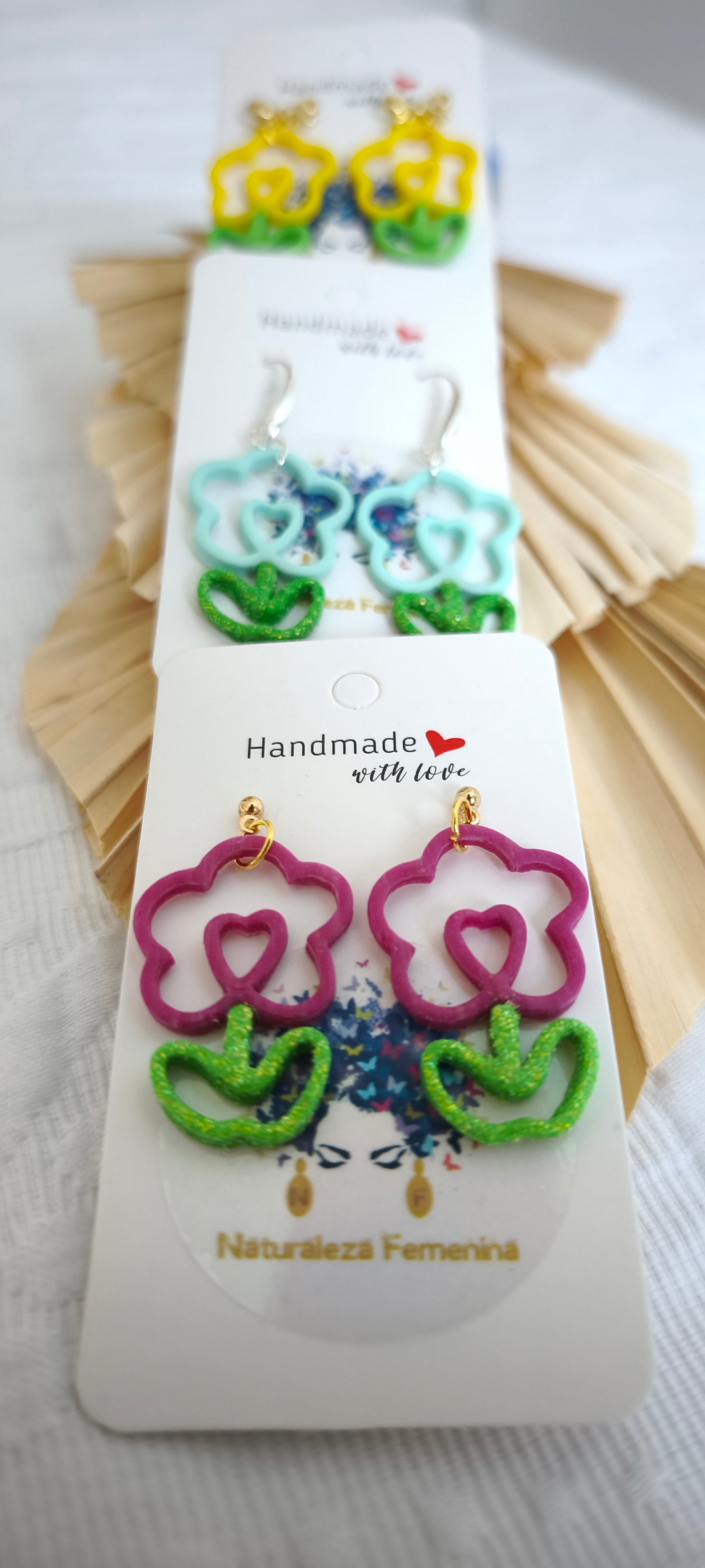 Dale un toque fresco y original a tu look con estos pendientes en forma de flor. Están elaborados a mano con materiales ligeros y resistentes, combinando un delicado tono verde menta para los pétalos con un vibrante verde brillante con destellos en las hojas.