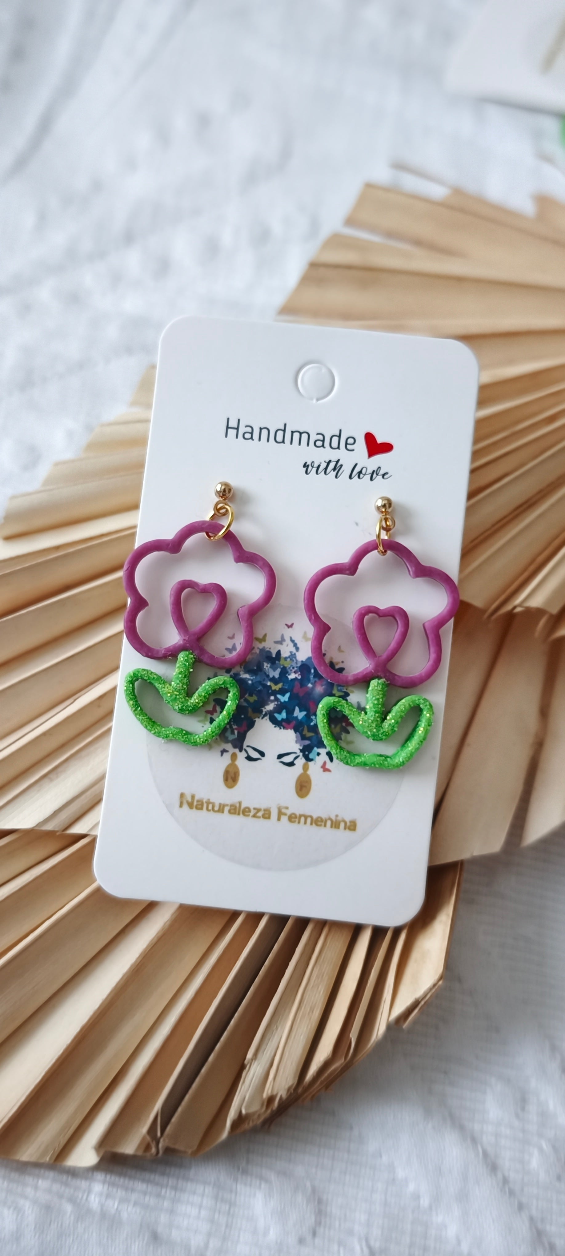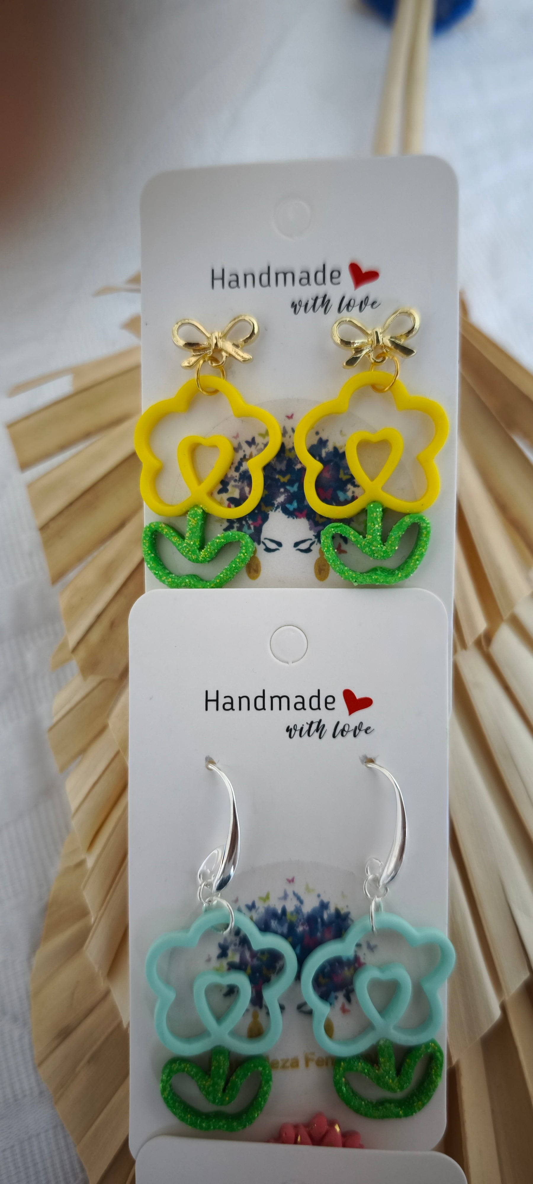 Dale un toque fresco y original a tu look con estos pendientes en forma de flor. Están elaborados a mano con materiales ligeros y resistentes, combinando un delicado tono verde menta para los pétalos con un vibrante verde brillante con destellos en las hojas.