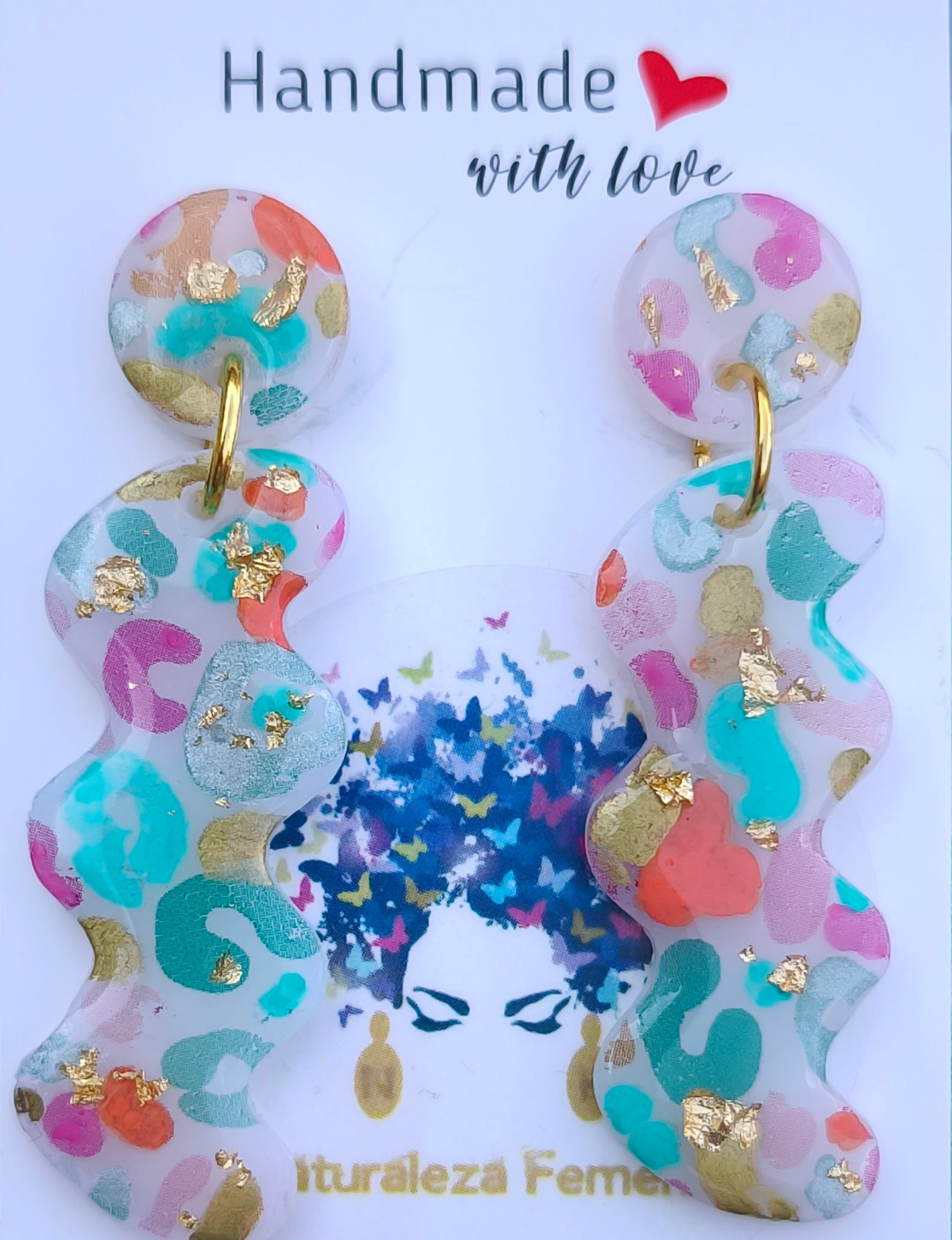 Pendientes Modelo Ondas de la Colección Oasis. Hechos de arcilla con detalles en azul, naranja,rosa y dorado. Decorado con pan de oro. Aro en acero inoxidable color dorado. ✨ Son hipoalergénicos, perfectos para pieles sensibles.