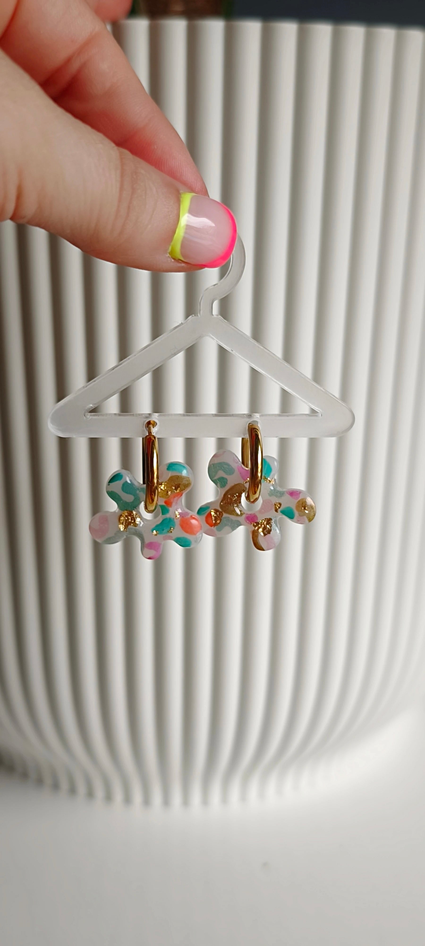 Pendientes Modelo Aros Flor Abstracta de la Colección Oasis. Hechos de arcilla con detalles en azul, naranja,rosa y dorado. Decorado con pan de oro. Aro en acero inoxidable color dorado. ✨ Son hipoalergénicos, perfectos para pieles sensibles.